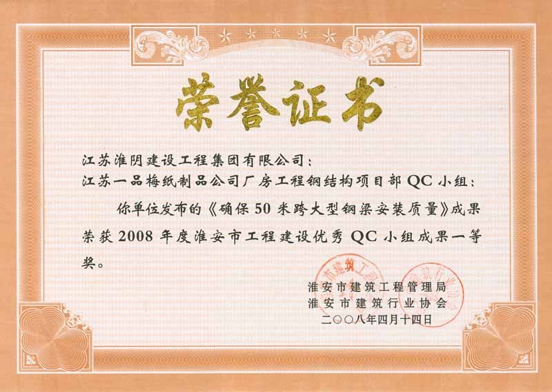 2008年市级QC一等奖(江苏一品梅纸制品公司厂房-确保50米跨大型钢梁安装质量)