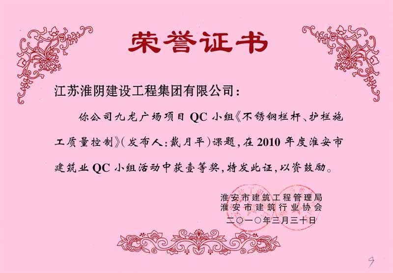 2010年市QC(一等奖)不锈钢栏杆、护栏施工质量控制(九龙广场项目部-戴月平)
